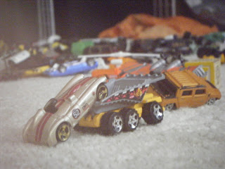 This photo is really out of focus, but for some reason I found it impossible to resist. A dump truck towing a sports car. Oh, the imagination of my baby.